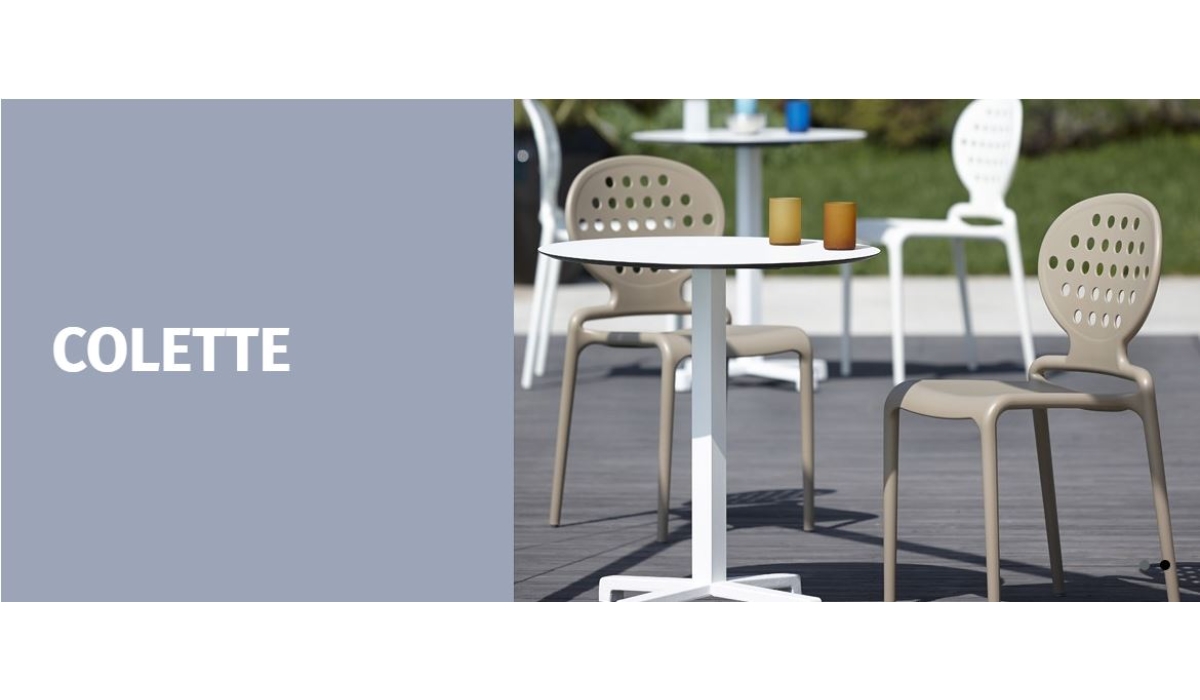 Scaunul de Terasa Colette este regasit in categoria de scaune confectionate in intregime din tehnopolimer reciclabil si intarit cu fibra de sticla, acest model de scaun fiind extrem de rezistent si confortabil, fara brate si usor de depozitat, perfect pentru amenajari exterioare sau interioare. Modelul Colette poate fi gasit la noi intr-o varietate de culori si nuante, precum albastru, gri porumbel, antracit, portocaliu.