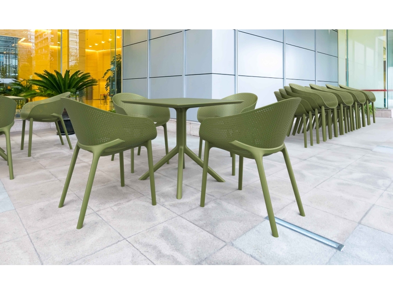 Scaune pentru exterior HORECA, scaune turnate si integral din polipopilena ranforsata cu fibra de sticla. Scaune rezistente la UV si pot avea ca destinatie atat ca scaune pentru exterior cat si pentru interior. Obtinute prin injectare dintr-o singura etapa, procedeu de ultima generatie si care asigura rezistenta in timp la rupere. Scaunul este certificat CATAS, certificat care atesta rezistenta la rupere. Intretinerea este foarte usoara.