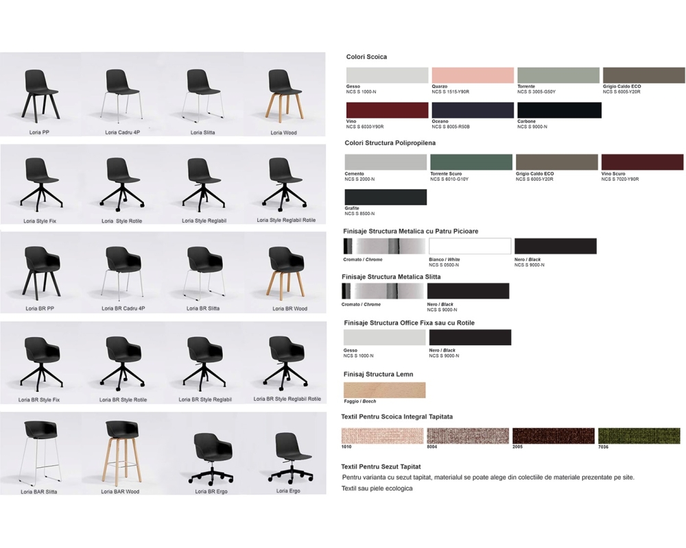 Colectia de scaune Loria ca soluție pentru o mare varietate de contexte și utilizări. Colecția este formată din carcase și rame care sunt total interschimbabile între ele și pot fi personalizate în culori și tapițerie. Scoicile scaunelor, fotoliilor și taburetelor sunt realizate din polipropilenă armată cu fibră de sticlă, obținând astfel amestecul perfect de ușurință și durabilitate.